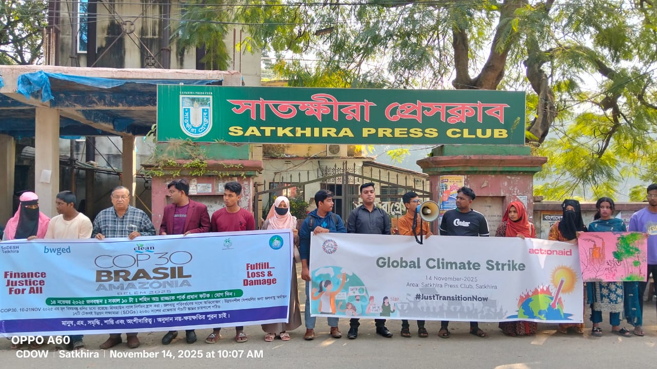 সাতক্ষীরায় গ্লোবাল ক্লাইমেট স্ট্রাইক অনুষ্ঠিত হয়েছে। ১৪ নভেম্বর সকাল ১০ টায় সাতক্ষীরা প্রেসক্লাবের সামনে সিডো সংস্থার বাস্তবায়নে সাতক্ষীরা ইয়ূথ হাবের আয়োজনে একশনএইড বাংলাদেশ ও গ্রোবাল প্লাটফম বাংলাদেশের সহযোগিতায় তরুণ জলবায়ু কর্মী এবং তাদের সংগঠনসমূহ গ্লোবাল ক্লাইমেট স্ট্রাইকে যোগ দিয়ে সবুজ, ন্যায্য ও সমতাপূর্ণ বিশ্বের দাবি জানিয়েছে। একযোগে অংশগ্রহন করেন স্বদেশ, বারসিক, ক্লিন ও বাপা সংস্থা সহ এক্টিভিস্টা সাতক্ষীরার যুব জলবায়ূ যোদ্ধারা। জাতিসংঘের বার্ষিক জলবায়ু পরিবর্তন সম্মেলন (কপ৩০) যখন ব্রাজিলের বেলেম শহরে অনুষ্ঠিত হচ্ছে, ঠিক সেই সময়েই এই সমাবেশটি সংঘটিত হলো। সমাজের সর্বস্তরের তরুণ জলবায়ু কর্মীরা একত্রিত হয়ে বৈশ্বিক জলবায়ু সংকট মোকাবিলায় বিশ্বনেতাদের কাছ থেকে ন্যায়বিচার-কেন্দ্রিক পদক্ষেপের দাবি জানায়।